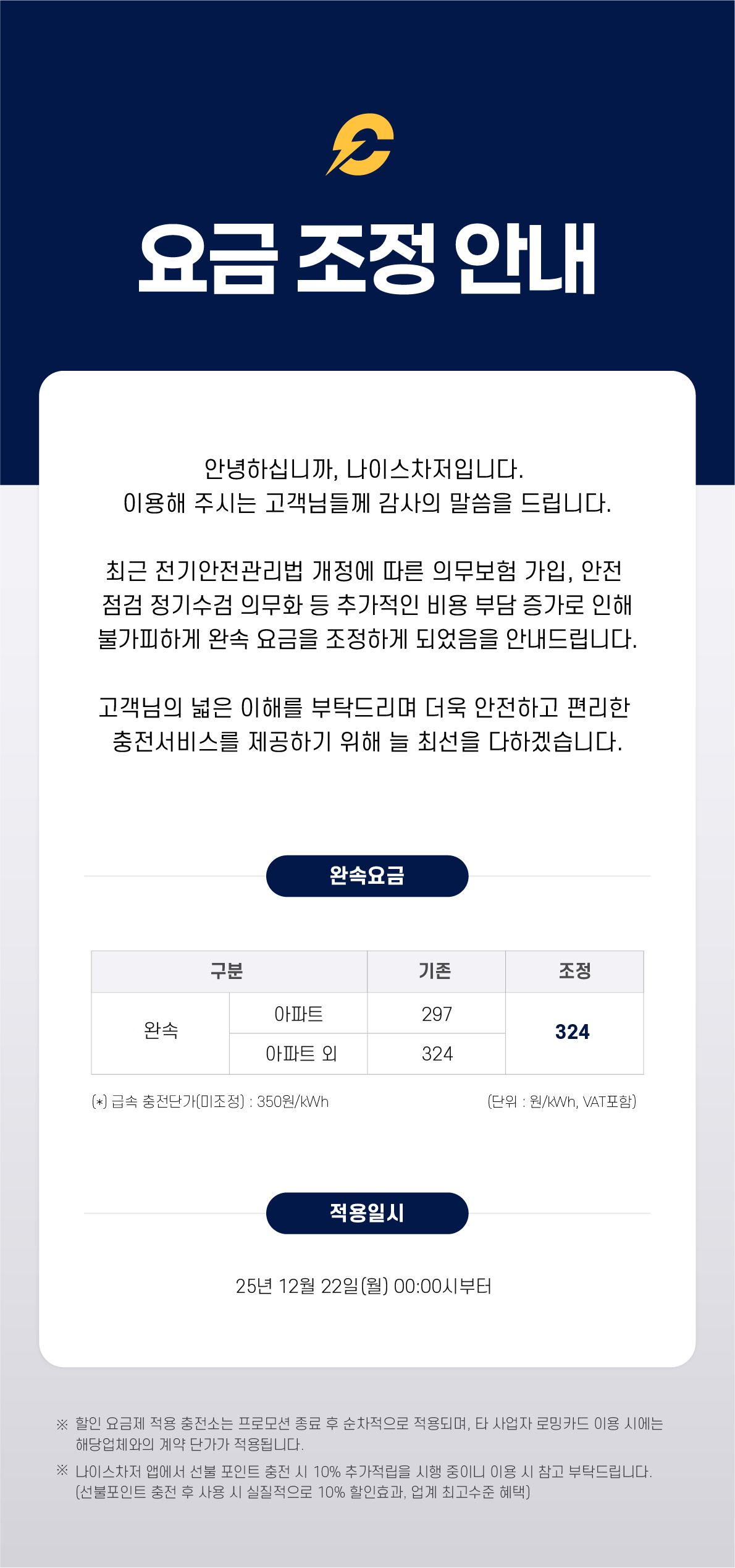 [공지] 나이스차저 연말 충전 서비스 요금 조정 안내(25.12.22)